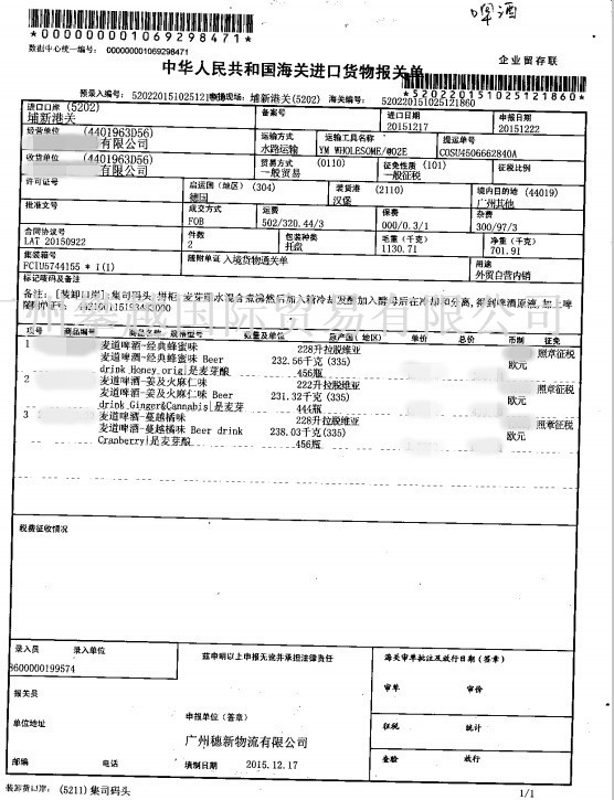 啤酒進(jìn)口報(bào)關(guān)單證展示:
